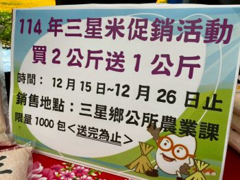 此外,鄉公所也同步延續「好禮加碼送」活動,凡於活動期間購買三星米任一包,即可獲得刮刮券1張,請於活動期間內(12月15日至12月26日)向公所兌換,逾期恕不兌換。獎項如下:2公斤三星米 20包(1名)10包(3名)5包(10名)