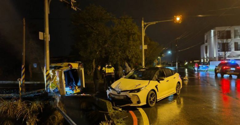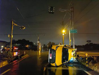【記者林周龍/三星報導】宜蘭縣三星鄉尚健三路二段及大德路二段一處農路路口,今年6月才發生重大車禍,不料昨(12)日晚8時許,該路口2度發生計程車與自小客車相撞交通事故,計程車當場側翻路邊,44歲雷姓男駕駛及26歲陳姓女乘客受傷經救護車急送羅東聖母醫院救治,乘客陳女右手骨折,車禍肇事原因正由警方調查釐清中。
