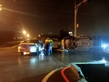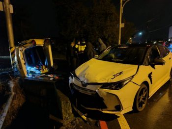 警方調查,駕駛計程車司機雷男昨晚載陳姓女乘客,沿大德路二段往三星(東往西)方向行駛,23歲陳姓男子駕駛白色轎車沿尚健三路二段往上將路三段(北往南),雙方行經事發路口,疑似未禮讓及減速導致車禍。