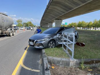 【記者林周龍/五結報導】五結路三段興仁五路三段路口,今(8)日上午9時26分,發生一起驚險交通事故,一輛曳引車變換車道時未注意死角,與同向小客車發生擦撞,導致小客車失控偏離車道,最後衝入路旁草皮,造成駕駛受傷送醫,所幸並無大礙。