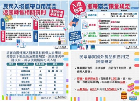 衛生局說明,攜帶一般食品回國,其價值在1,000美元以下且重量在6公斤以內者;錠狀、膠囊狀食品,每種至多12瓶(以原包裝為限),合計以不超過36瓶者,得免申請輸入查驗。超過限量者,則必須申請輸入查驗,經查驗符合食品安全衛生管理法規定,才可以帶回國內。