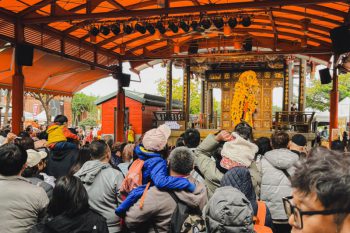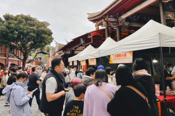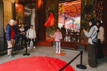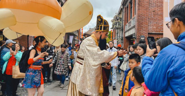 除了看戲,財神與金獅也在街區報喜,2/17-22初一至初六每日11:30與14:30踩街出發,Q版財神派送喜糖、金獅靈動穿梭街區,不少民眾駐足拍照,直呼「這才有過年感!」,文昌祠的「飛馬呈祥—跋杯祈福」活動吸引排隊人潮,大家為新一年祈求好運與前途光明。