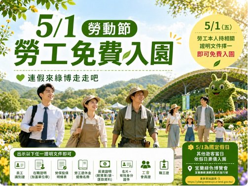 (宜蘭大新聞中心/蘇澳報導)為歡慶五一國際勞動節,向全國勞工朋友致上誠摯感謝與敬意,宜蘭縣政府特別推出專屬好康,於5月1日(星期五)勞動節當天,邀請全國勞工免費參觀「2026宜蘭綠色博覽會(綠博)」,一起輕鬆出遊、共享綠意假期。
