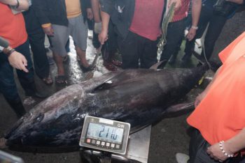 (記者張金源/蘇澳報導)今年蘇澳地區第一「鮪」在大眾引領企盼中,由「日福26號」拔得頭籌,首傳捷報捕獲這尾重約「211」公斤的黑鮪魚,是由船主:邱春土,船長:邱進龍於北緯25°01’東經123°45’釣魚台附近海域捕獲。