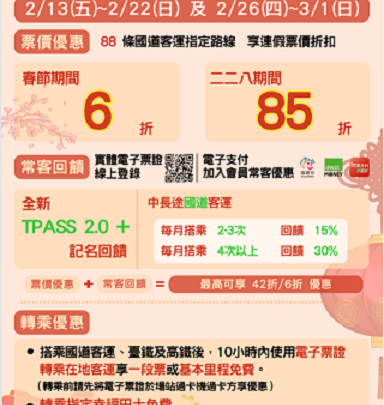 為鼓勵民眾於連假期間利用公共運輸,交通部公路局推出多項優惠措施,票價優惠部分,計有88條國道客運路線享有票價折扣,春節為原價6折(優惠期間自2月13日0時起至2月22日24時止)、228和平紀念日為原價85折(優惠期間自2月26日0時起至3月1日24時止);另轉乘優惠部分,搭乘國道客運、臺鐵、高鐵於10小時內轉乘在地客運享基本里程或1段票免費優惠,以及指定幸福巴士路線全程免費。