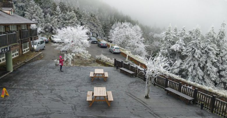 海拔2000公尺的太平森林遊樂區,受到強烈冷氣團及東北季風影響,今天清晨氣溫降至攝氏4度,雖然天空沒有下雪,但是太平山莊前木棧道上覆蓋一層薄薄的霜,山區也有霧淞,宛如此國風情畫,上山旅遊的民眾紛紛拿起手機拍下清晨日出金陽與霧淞銀輝在雲海之上交映的美景,不少遊客大喊不虛此行。