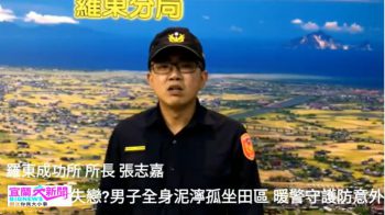 羅東警分局成功派出所警員莊育霖昨天下午時許獲報,羅東鎮北成路一段近觀天下大樓旁,有男子全身泥濘孤坐田區,員警到場發現男子情緒低落不願接受警方協助,為防止憾事發生,莊員於岸邊耐心喊話近一小時,並委言傾聽男子心聲,經員警鍥而不捨循循善誘,林男(32歲)終卸下心防,得知是因感情因素意志消沉,經聯繫林男家屬到場,在家人等苦勸開導下,男子始重拾希望自行步行上岸,顧及安全莊員不畏泥濘陪同護送返家,另轉由林男父領回照顧。