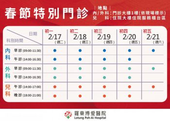 羅東博愛醫院春節特別門診自2月17日(初一)至2月21日(初五)開設,內科、外科門診早診9時至11時30分,午診14時至16時30分 (初五僅提供早診),兒科午診14時至17時、晚診為18點至21時(初五僅提供午診)。症狀較輕者可優先利用春節門診就醫,不僅可減少等候時間,讓急診資源能真正留給需要緊急救治的重症患者,同時提升民眾在長假期間取得醫療服務的可近性。