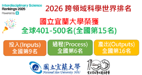 (宜蘭大新聞中心/宜蘭報導)國際高等教育評比機構《泰晤士高等教育》(Times Higher Education,THE)昨(20) 日公布 2026 年「跨領域科學排名(Interdisciplinary Science Rankings,ISR)。國立宜蘭大學首次參與即取得亮眼成績,名列全球第 401-500 名、全台第 15 名(名列國立大學第10名),展現宜大在跨領域研究與教學上的深厚能量與發展潛力。