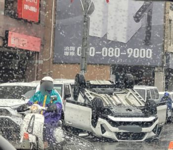 【記者林周龍/宜蘭報導】車水馬龍行人如線的宜蘭市中山路二段,今(28)日發生交通事故,2輛小客車擦撞,白色休旅車龜翻覆後四輪朝天,37歲駕駛受傷送宜蘭陽明交大醫院救治,傷勢無大礙,車禍發生原因及推行責任正由宜蘭分局鑑定調查中。
