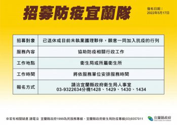 林縣長表示,由於疫情嚴峻,衛生局、衛生所同仁工作壓力繁重,為了快速服務民眾,請求退休或目前沒有在職業中的護理夥伴,加入公共衛生的行列,協助衛生局、衛生所處理行政工作;呼籲有意願的白衣天使電洽衛生局人事室(03-9322634轉1428-1430),一同加入「防疫宜蘭隊」,共同抗疫、保護全民健康。