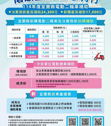另環保局指出,老舊燃油機車排放空氣污染物,不僅影響空氣品質,也危害民眾健康。本年度凡汰除民國103年底前出廠之燃油機車並購買電動二輪車者,最高可獲補助2萬4,300元;若僅新購電動二輪車,亦可獲最高1萬7,000元補助。今年也新增老舊機車純淘汰補助,每輛補助500元。補助詳情可至宜蘭縣環保局網站(http://www.ilepb.gov.tw/)查詢,或洽詢本縣機車定檢服務專線(03-9901529)。
