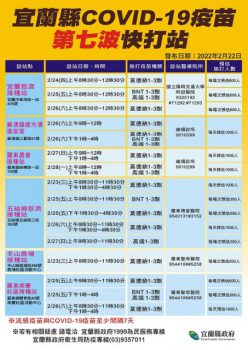 (宜蘭大新聞中心/宜蘭報導)由於國內疫情尚未完全穩定,多數人都以為Omicron感染都是輕症不用擔心,但全球疫情仍屬嚴峻,鄰近多國新增病例持續增加,宜蘭縣配合中央政策已成立第6波快打站,截至111年2月20日計有42,952人接種,宜蘭縣完成第三劑接種人數共計165,962人。為方便民眾能快速接受疫苗施打,衛生局協調醫療院所,於23日至28日再加開COVID-19疫苗第七波快打站(如附圖),本次施打疫苗種類為1-3劑莫德納為主,仍有BNT疫苗及高端疫苗,免預約隨到隨打,請符合疫苗接種資格之縣民,儘速接種疫苗,以提升個人免疫力。
