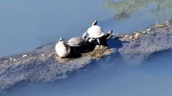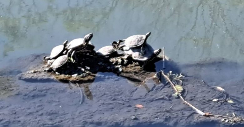 一般常見在河邊曬太陽的烏龜種類,通常有台灣斑龜、中華鱉,以及近年常見的外來種紅耳龜(巴西龜),烏龜喜歡成群結隊地在同一塊石頭上曬太陽,有時會疊羅漢,畫面療癒且呆萌,陽光能提升牠們的新陳代謝,在涼爽區與溫暖區之間切換,避免中暑,曬太陽時,只要稍有風吹草動或受到驚嚇,牠們會迅速跳入水中,警覺性相當高,路過的民眾看到這大自然生態,用手機拍下難得一見的鏡頭。