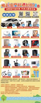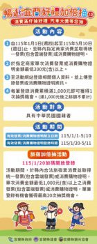 抽獎活動最後登錄發票或消費購物證明日期為115年5月10日,上網登錄開始時間為115年1月20日08:00起,截止時間為115年5月11日23:59止。本活動預計115年3月辦理第1波線上公開抽獎,獎項有65吋電視、電動掃地機、無線吸塵器、平板型電腦、變頻洗衣機、除濕機、智慧型手錶、電玩遊戲機等多項3C產品好禮,並預計於115年5月辦理第2波線上公開抽獎及實體公開抽獎,獎項將抽出最大獎汽車、電動機車、智慧型手機、按摩椅、65吋電視、電動掃地機、無線吸塵器、廚餘機等多項3C產品好禮。