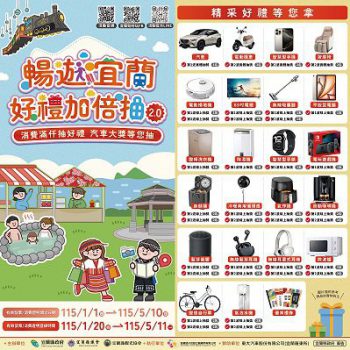「暢遊宜蘭好禮加倍抽2.0活動」活動期間自115年1月1日起至115年5月11日止,全國民眾於宜蘭縣內合法旅宿業者、觀光工廠、休閒農場、博物館家族、蘭陽原創館、本縣轄借問站、歷屆好食/好物/好羹獲獎商家、JINHO宜蘭敬好生活 、宜!蘭青創品牌、宜蘭嚴選之商家、頭城五漁鐵獲獎商家等指定商家,消費並取得發票或消費購物證明後,於活動官網完成登錄,滿仟即可參與抽獎,不同張次的發票,消費金額可合併計算。獎項內容多元豐富,包含汽車、電動機車、智慧型手機及按摩椅等多樣好禮,讓民眾在暢遊宜蘭、買好物吃好料、抽大獎,一次享受三重樂趣。
