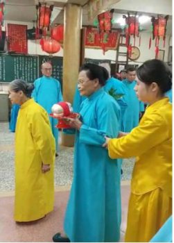 母親為了感恩無極瑤池金母救命之恩,在神前發願救世的她,從此為宜蘭慈惠堂40載的義工,除了有要事否則從不缺席,每逢初一十五及重要的節假日,母親一定自資長途跋涉從台北到宜蘭慈惠堂從事通靈義工服務,救贖許許多多有需幫助的信眾。90歲時終獲上天感應,無極瑤池金母正駕降臨隆賜大紅袍予母親,肯定其慈善行誼。