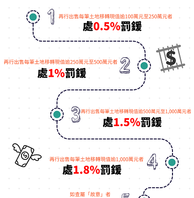 財稅局進一步說明,依稅務違章案件裁罰金額或倍數參考表,稽徵機關可視個案違章情節輕重,給予0.5%至1.8%等不同程度處罰,如查屬故意者,處再行出售移轉現值2%之罰鍰,但若符合稅務違章案件減免處罰標準第18條第2項規定,其移轉現值在100萬元以下者,或辦竣權利移轉登記前經依規定撤回或註銷移轉現值申報者,免予處罰。