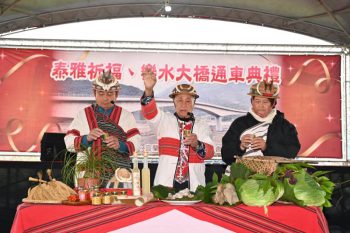 典禮由部落文化展演揭開序幕,隨後由泰雅族耆老進行祈福儀式,最後以傳統獵刀砍藤完成的剪綵象徵正式通車,展現三部落情感與交通脈絡重新連接的意義。期盼樂水大橋成為守護族人與用路人安全的重要門戶,帶動地方邁向更穩定、安全的未來。
