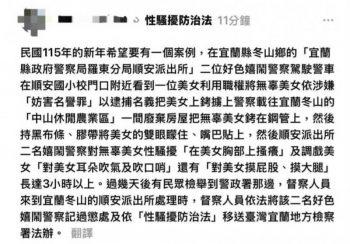 文中又說,「2名警察在美女胸部上搔癢、耳朵吹氣及吹口哨、摸屁股、摸大腿長達3小時以上,過幾天後有民眾檢舉到警政署,督察人員到順安派出所處理,依性騷擾防治法移送宜蘭地檢署法辦」。文章PO上30分鐘後刪文,但因內容描述危言聳動,嚴重破壞警察「人民保姆」形像,引起外界關注。
