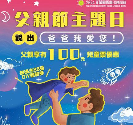 (宜蘭大新聞中心/五結報導)鼓勵爸爸與小孩共遊宜蘭童玩節,2024宜蘭國際童玩藝術節在8月8日父親節當天推出優惠活動,只要在各票口同行的孩子對爸爸說「爸爸我愛您」,父親即可享有「兒童券」100元入園的優惠,親子一起輕鬆遊童玩節,8月8日、9日兩天並加碼贈送88張的木藝、紙藝DIY體驗券,親子一起在工藝師的指導下手作童玩,共創難忘的父親節回憶。