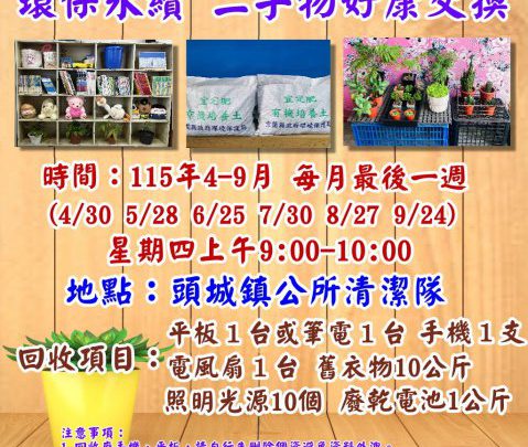 (宜蘭大新聞中心/頭城報導)為持續推廣『垃圾減量及資源再利用』環保政策,頭城鎮公所今(115)年再度辦理「資源回收物交換二手物活動及二手物定點檢修站」,提供一個資源回收再利用交換平臺,家中有閒置完好物品,想丟又捨不得、想留又怕佔空間,有小故障想修理桌椅,都可以帶來清潔隊唷。鎮民朋友拿出指定回收項目,即可兌換精美又實在的二手玩具、書籍、盆栽及有機培養土。