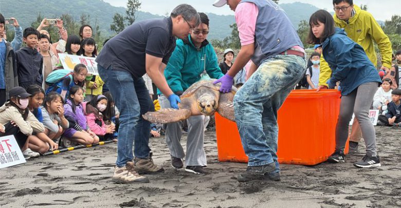 【記者林周龍/蘇澳報導】今年元月間頭城梗枋海域有一隻龜齡約20歲的赤蠵龜龜背被漁船螺旋槳擊中,漁民將受傷的赤蠵龜帶回漁港,交由鯨豚協會救援,經過2個月的悉心照顧,赤蠵龜已恢復健康,蘇澳岳明國中小學師生,今(22)日於無尼港將赤蠵龜回放大海。