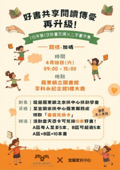 【記者林周龍/羅東報導】為推廣閱讀風氣並結合公益行動,羅東鎮立圖書館將於4月18日上午9時至下午3時,在李科永紀念館一樓大廳舉辦「115年第1次好書交換×二手書市集」活動,今年活動特別攜手宜蘭家扶中心合作,除延續往年好書交換機制外,更進一步擴大公益參與,讓閱讀的力量溫暖更多需要的家庭。