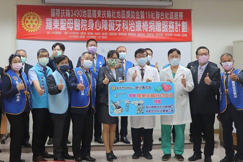 (宜蘭大新聞/羅東報導)與羅東聖母醫院長期互動友好的羅東扶輪社,發揮其熱心公益的國際「扶輪」精神,日前主動與該院連繫,聯結宜蘭縣所有扶輪社及其他友社的團隊愛心,集體捐贈一台身心障礙專用牙科治療椅及移動式治療推車,藉以強化身心障礙者牙科醫療照護,期盼因此提升身心障礙者的牙科就診率,另外移動式治療推車,對於住院臥床的患者,可以即時進行牙科治療,大大提升臨床牙科治療的方便性。