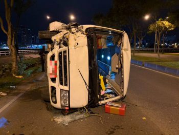 【記者林周龍/羅東報導】羅東鎮傳藝路昨(27)日晚間10時12分許,發生一起交通事故,1輛自小型巴士疑自撞路樹翻覆,車輛損壞嚴重,擋風玻璃碎裂,慢車道地上留下許多常事榜樣,所幸車上無乘客,駕駛也未受傷,車禍原因正由羅東分局調查釐清中。