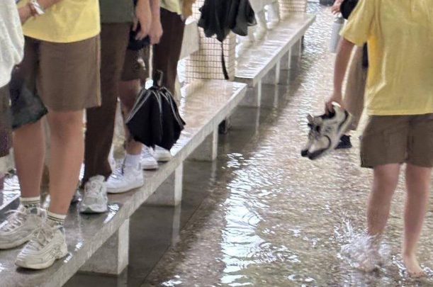羅高校長張家豪表示,今天暴雨來得急、退得也快,淹水約一個多小時後便退去。由於校園地勢低漥,遇到強降雨時,周邊道路積水會湧入校園,導致排水系統負荷過重、宣洩不及,因此風雨走廊等區域容易積水。