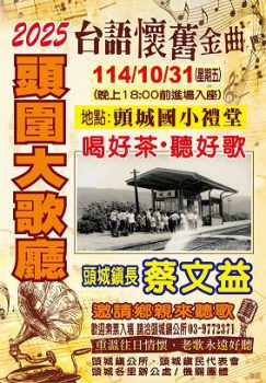(宜蘭大新聞中心/頭城報導)一年一度最受在地鄉親期待的音樂盛事—「2025頭圍大歌廳 聽好歌 喝好茶」,即將於10月31日(星期五)晚上6點,在頭城國小禮堂盛大開演!本活動已邁入第四屆,不僅延續往年佳評如潮的熱烈回響,更升級內容,勢必帶給鄉親一場懷舊與感動交織的音樂饗宴。
