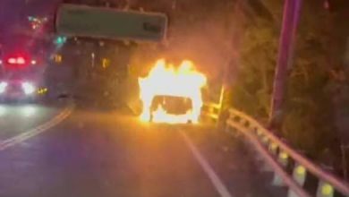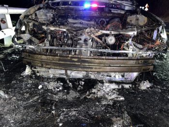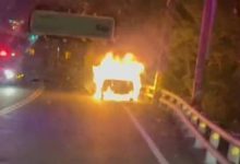 宜蘭縣消防局今天凌晨零時49分接獲通報,台9線蘇花公路113.9公里處,有一輛自小客車冒煙起火燃燒,請求派員前往搶救,南澳、觀音分隊人車趕到現場時,轎車已燒成一團火球,幸好車上邱姓駕駛及乘客4人已及時逃出門外,故未造成傷亡。