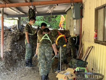 颱風過後,永春里野溪旁住戶遭石流侵襲,約有十戶受災,停在家門前的自小客車也被埋在土石堆中,救災國軍官兵不畏辛苦,13日起每天派遣數十名兵力清理土石,啟德團隊同步支援1輛怪手、2輛小山貓救災,由於土石量龐大,國軍與啟德團隊連續清理四天,現場仍有大量土石未完全清除。