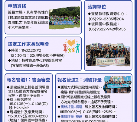詳細事宜請參閱「宜蘭縣115學年度國民中學學術性向(數理類或語文類)資賦優異學生鑑定安置簡章」,若有任何疑問,請洽宜蘭縣立復興國民中學(03-9322942轉5153) 或宜蘭縣特教資源中心(03-9312385轉204)。