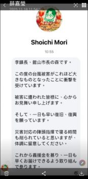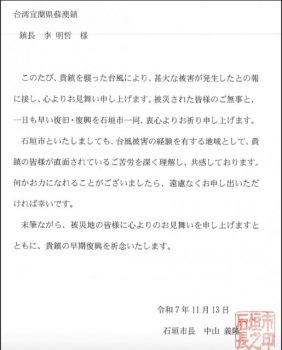 沖繩縣石垣市長中山義隆得知蘇澳遭遇水患重創,以親函方式來信慰問。信函內容指出,石垣市同樣經歷過颱風重創,感同身受蘇澳此刻面臨的困境,期盼受災民眾平安且早日重建家園,如需協助,石垣市願意伸出援手。