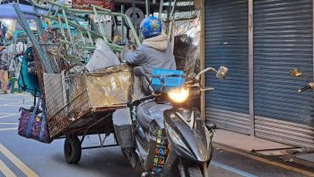 羅東街頭近日出現驚人景象,一輛機車搖身一變成了「移動回收城堡」,只見一名年約60餘歲的阿伯騎著機車緩緩前行,車尾懸掛板車上面卻綁滿數十袋回收瓶罐及萬能角鋼,幾乎把整輛機車吞沒,只剩車頭露出,遠遠從後方望去,就像是一座小山在馬路上緩慢移動,經過羅東鎮大同路地下道時,超高的角鋼抵住水泥頂端發出吱吱聲響及噴出火發,阿伯仍猛催油門,把地下道照明設備戮壞數盞。