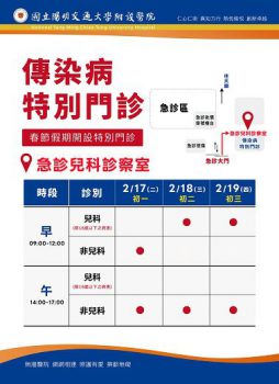 (宜蘭大新聞中心/宜蘭市報導)農曆新年將至,為因應春節期間就醫需求,國立陽明交通大學附設醫院公告115年春節門診表,除了維持急診 24 小時服務外,特別於年初一至年初三開設「傳染病特別門診」,協助疏解急診人潮,提供民眾更即時的醫療服務。