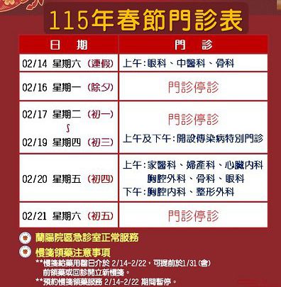 - 停診資訊: 除夕(2/16)至初三(2/19)、初五(2/21)一般門診全面停診。