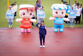 序幕表演之後,緊接著是會旗進場及運動員宣誓,盼望所有選手都能服從大會規章與裁判判決,並發揚運動家精神完成本次賽事。此次擔任宣誓的運動員代表是礁溪國中林俐昕同學,俐昕同學為8年級學生,已成為學校排球隊的中流砥柱,相信未來必能持續發光發熱,為宜蘭縣爭取更多榮耀。
