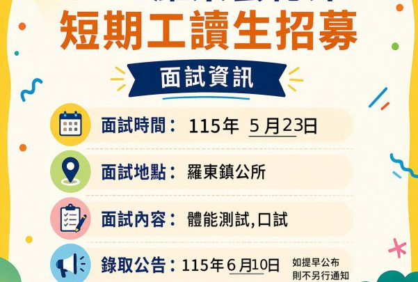 報名方式:進入羅東觀光旅遊網最新消息,找到「『2026羅東藝穗節』短期工讀生招募」,填寫報名表格後回傳。相關規定請參閱簡章。
